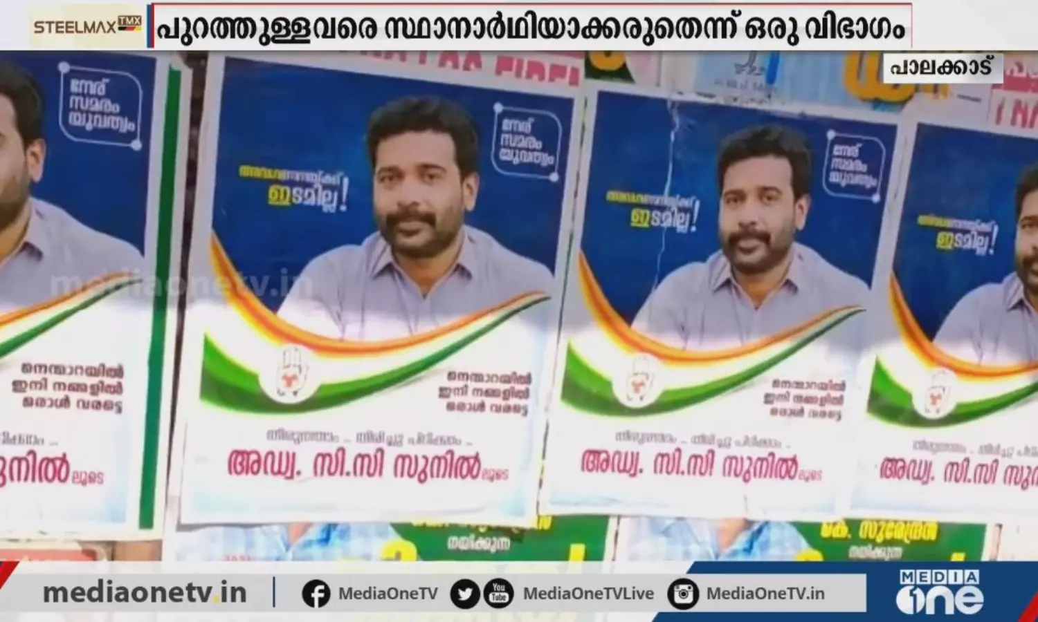 പാലക്കാട് നെന്മാറ മണ്ഡലത്തിൽ കോൺഗ്രസിൽ പൊട്ടിത്തെറി. നെന്മാറ മണ്ഡലത്തിന് പുറത്തുള്ളവരെ സ്ഥാനാർഥിയാക്കരുതെന്നാണ് ഒരു വിഭാഗത്തിന്റെ ആവശ്യം. അഡ്വക്കറ്റ് സി.സി സുനിലിനായി മണ്ഡലത്തിലുടനീളം പോസ്റ്ററുകൾ ഉയർന്ന് കഴിഞ്ഞു.