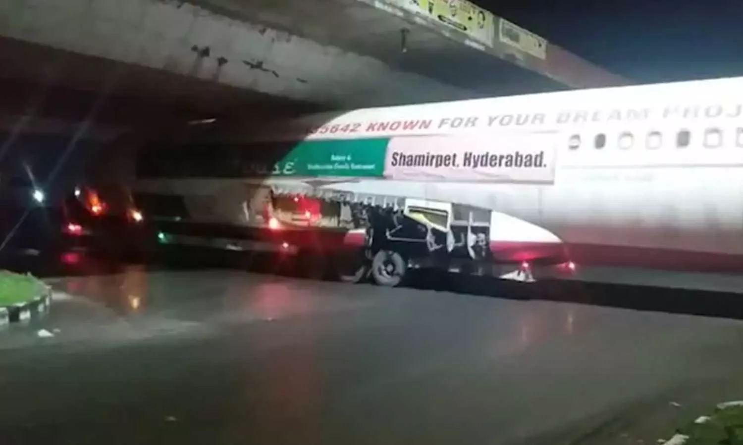 Summary: An old airoplane that was bought by Hyderabad's Pista House owner from Thiruvananthapuram international airports' auction got stuck at an underpass in Bapatla district, Andhra Pradesh. The plane was being transported by road from Kochi to Hyderabad