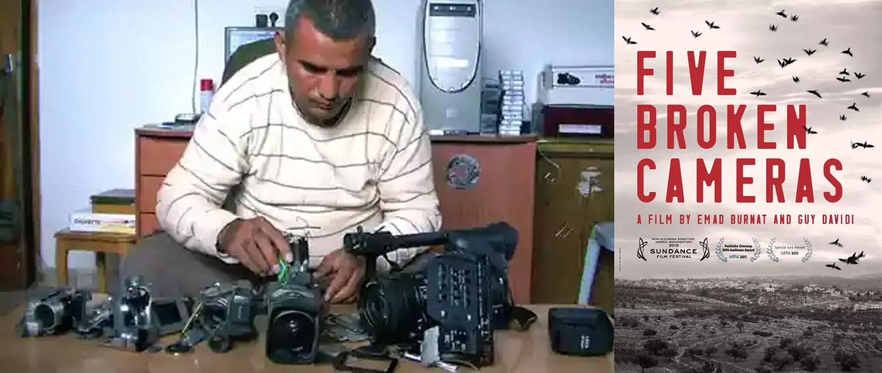 ഇതില് നിന്നും വ്യത്യസ്തമായി വ്യക്തിയില് നിന്ന് ആള്ക്കൂട്ടത്തിലേക്കുള്ള വികാസമാണ് ' ഫൈവ് ബ്രോക്കണ് ക്യാമറാസ് (5 Broken Cameras)' എന്ന ഡോക്യുമെന്ററി കാഴ്ചവെക്കുന്നത്. എമാദ് ബര്ണറ്റിന്റെ (Emad Burnat) ജീവിതാനുഭവങ്ങളാണ് അദ്ദേഹം സ്വന്തം സുഹൃത്തും ഇസ്രായേലിയുമായ ഗെയ് ദവീദി (Guy Davidi) യുമായിചേര്ന്ന് ക്യാമറയിലേക്ക് പകര്ത്തുന്നത്. ചിത്രം പകര്ത്തിയത് ബര്ണറ്റും അതിന്റെ വാമൊഴിയൊരുക്കിയത് ദവീദിയുമാണ്. ബര്ണറ്റിന്റെ ജീവിതത്തില് അദ്ദേഹം വാങ്ങിയ അഞ്ച് ക്യാമറകളിലൂടെ അദ്ദേഹം പകര്ത്തിയ സ്വന്തം ജീവിതവും അയാള്ക്ക് ചുറ്റും നടക്കുന്ന അതിജീവനപ്പോരാട്ടവുമാണ് ഡോക്യുമെന്ററിയുടെ വിഷയം. ഓരോക്യാമറയും ഒരോ അതിക്രമങ്ങളുടെ സാക്ഷിയായി മാറുകയും അതിജീവനത്തിന് വേണ്ടിയുള്ള പോരാട്ടമായി ഉയിര്ക്കുകയും ചെയ്യുന്നു. അഞ്ച് ക്യാമറകളിലൂടെ അഞ്ച് പോരാട്ടങ്ങളാണ് ബര്ണറ്റും ദവീദിയും നമ്മുടെ മുന്നിലേക്ക് തുറന്നിടുന്നത്. സ്വന്തം ജീവിതത്തെ ഓരോ ക്യാമറയും പല ഭാഗങ്ങളായി മുറിച്ചെടുക്കുന്നുണ്ട് സിനിമയില്. അതോടൊപ്പം ഫലസ്തീനില് നടക്കുന്ന ഇസ്രായേലി അധിനിവേശത്തിന്റെയും ഫലസ്തീന് ചെറുത്തു നില്പ്പിന്റെയും ചിത്രവും സിനിമ നമുക്ക് നല്കുന്നുണ്ട്. 2005 ല് ബര്ണറ്റിന്റെ ആദ്യ പുത്രന് ഗിബ്രിയേല് ജനിക്കുമ്പോഴാണ് ബര്ണറ്റ് ആദ്യ ക്യാമറ വാങ്ങുന്നതും അവന്റെ ജീവിതം ചിത്രീകരിക്കുന്നതും. പിന്നീട് മകന്റെ വളര്ച്ചയുടെ ഓരോ ഘട്ടവും ചിത്രീകരിക്കുമ്പോള് അതിന് സമാന്തരമായി നടക്കുന്ന ഫലസ്തീന് പോരാട്ടവും അദ്ദേഹം ചിത്രീകരിക്കുന്നുണ്ട്. ഈ പോരാട്ടങ്ങള് പകര്ത്തുന്നതിനിടയില് പട്ടാളം തകര്ക്കുന്നതാണ് ഓരോ ക്യാമറയും. ക്യാമറ തകര്ന്നുവെങ്കിലും ഫലസ്തീന് പോരാട്ടങ്ങള് ഇപ്പോഴും കെടാത്ത കനലായി നിലനില്ക്കുന്നു എന്നത് അധികാരത്തിന്റെ നശ്വരത നമ്മെ ബോധ്യപ്പെടുത്തുന്നതാണ്.
