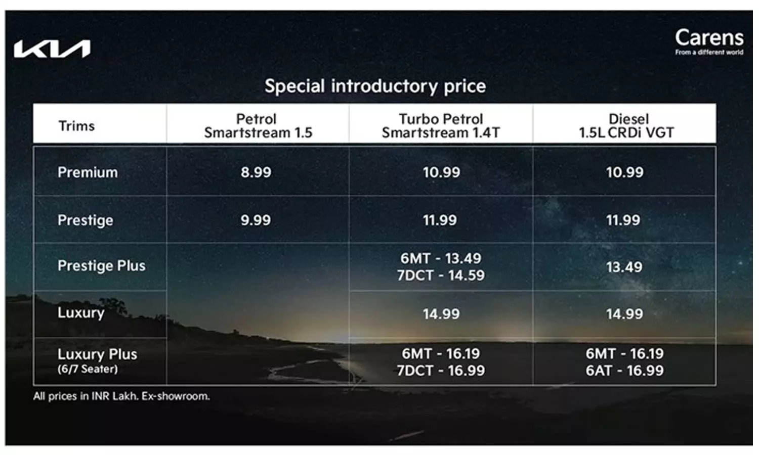 കിയ കാരൻസ് ഔദ്യോഗികമായി പുറത്തിറങ്ങി; വിലയും പുറത്തുവിട്ടു