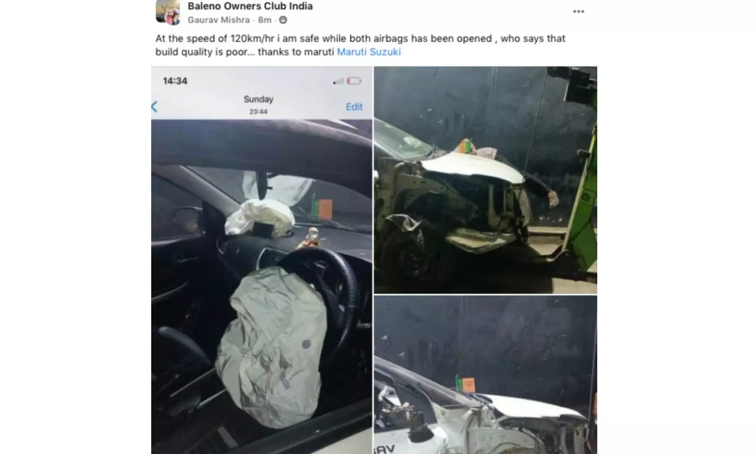 മാരുതി സുസുക്കി വാഹനങ്ങൾ ഇടക്കൊക്കെ സേഫ്റ്റി കുറവാണ് എന്ന് പഴി കേൾക്കാറുണ്ട്. എന്നാൽ ആ വിമർശനങ്ങൾ തെറ്റാണെന്ന് തെളിയിച്ചിരിക്കുയാണ് ഒരു മാരുതി സുസുക്കി ബലേനോ ഉപഭോക്താവ്. 120 കിലോമീറ്റർ വേഗതയിൽ വന്ന മാരുതി ബെലേനോ അപകടത്തിൽ പെട്ടിട്ടും ഡ്രൈവർ സുരക്ഷിതനായിരിക്കുന്നു. ബലെനോ ഓണേഴ്സ് ക്ലബ്ബ് ഫേസ്ബുക്ക് പേജിൽ ഗൗരവ് മിശ്ര എന്ന ഉപഭോക്താവാണ് തന്റെ അനുഭവം പങ്കുവെച്ചിരിക്കുന്നത്.