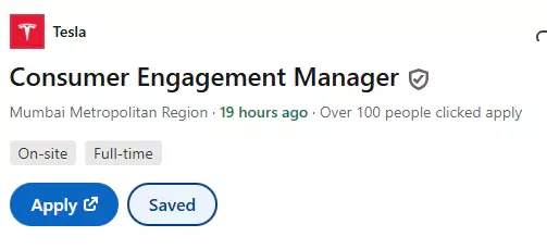 ‘ലിങ്ക്ഡ്ഇനി’ൽ വന്ന ജോബ് പോസ്റ്റിൽ ടെസ്ല മുംബൈയിലും ഡൽഹിയിലുമായി 13 തസ്തികകളിലേക്കാണ് ഉദ്യോഗാർഥികളെ തേടുന്നത്. സർവീസ് ടെക്നീഷ്യൻസ്, കസ്റ്റമർ എൻഗേജ്മെന്റ് മാനേജേഴ്സ്, ഡെലിവറി ഓപറേഷൻസ് സ്പെഷലിസ്റ്റ്സ് തുടങ്ങിയ പോസ്റ്റുകളിലേക്കാണ് നിയമനം.