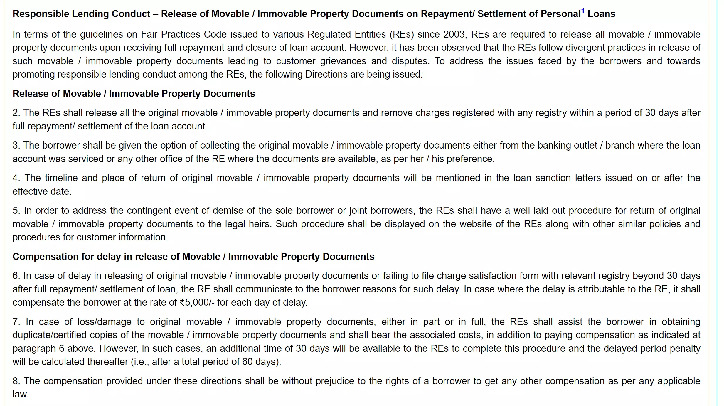 വായ്പ അടച്ചുതീർത്ത ശേഷവും ഈട് നൽകിയ രേഖകൾ തിരികെ ലഭിക്കാൻ ബുദ്ധിമുട്ട് നേരിടുന്നു എന്ന പരാതിയുടെ അടിസ്ഥാനത്തിലാണ് ആർബിഐയുടെ നിർദേശം. എല്ലാ വാണിജ്യബാങ്കുകൾക്കും ബാങ്കിതര ധനകാര്യ സ്ഥാപനങ്ങൾക്കും നിർദേശം ബാധകമാണ്.