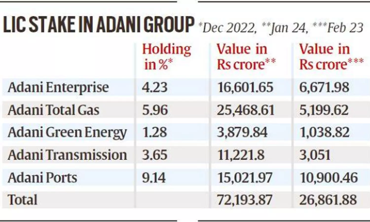 സ്റ്റോക്ക് എക്സ്ചേഞ്ച് വിവരങ്ങൾ പ്രകാരം അദാനി ഓഹരികളിൽ 28,400 കോടി രൂപയുടെ നിക്ഷേപമാണ് എൽ.ഐ.സിക്കുള്ളത്. അദാനി പോർട്ടിൽ 9.14 ശതമാനവും അദാനി ടോട്ടൽ ഗ്യാസ് ലിമിറ്റഡിൽ 5.96 ശതമാനവും അദാനി എന്റർ പ്രൈസസിൽ 4.23 ശതമാനവും അദാനി ട്രാൻസ്മിഷനിൽ 3.65 ശതമാനും അദാനി ഗ്രീൻ എനർജിയിൽ 1.28 ശതമാനും ഓഹരികളാണ് എൽ.ഐ.സിക്കുള്ളത്.