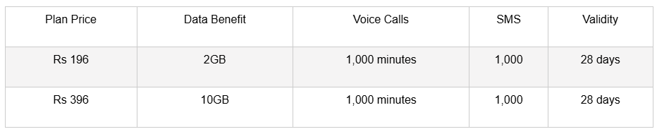 നിലവിൽ രണ്ട് റീചാർജ് പ്ലാനുകളാണ് ഉള്ളത്, 196 രൂപയുടെയും 396 രൂപയുടെയും പ്ലാനുകളാണത്. രണ്ടും 28 ദിവസത്തെ വാലിഡിറ്റിയാണ് നൽകുന്നത്. ഈ പ്ലാനുകൾ ബിഎസ്എൻഎൽ നെറ്റ്വർക്കിലെ ഉപയോഗത്തിന് മാത്രമുള്ളതാണ്. എയർടെൽ, വോഡഫോൺ ഐഡിയ തുടങ്ങിയ മറ്റ് നെറ്റ്വർക്കുകളിലെ ഉപയോക്താക്കൾക്ക് അവ ഉപയോഗിക്കാൻ കഴിയില്ല.