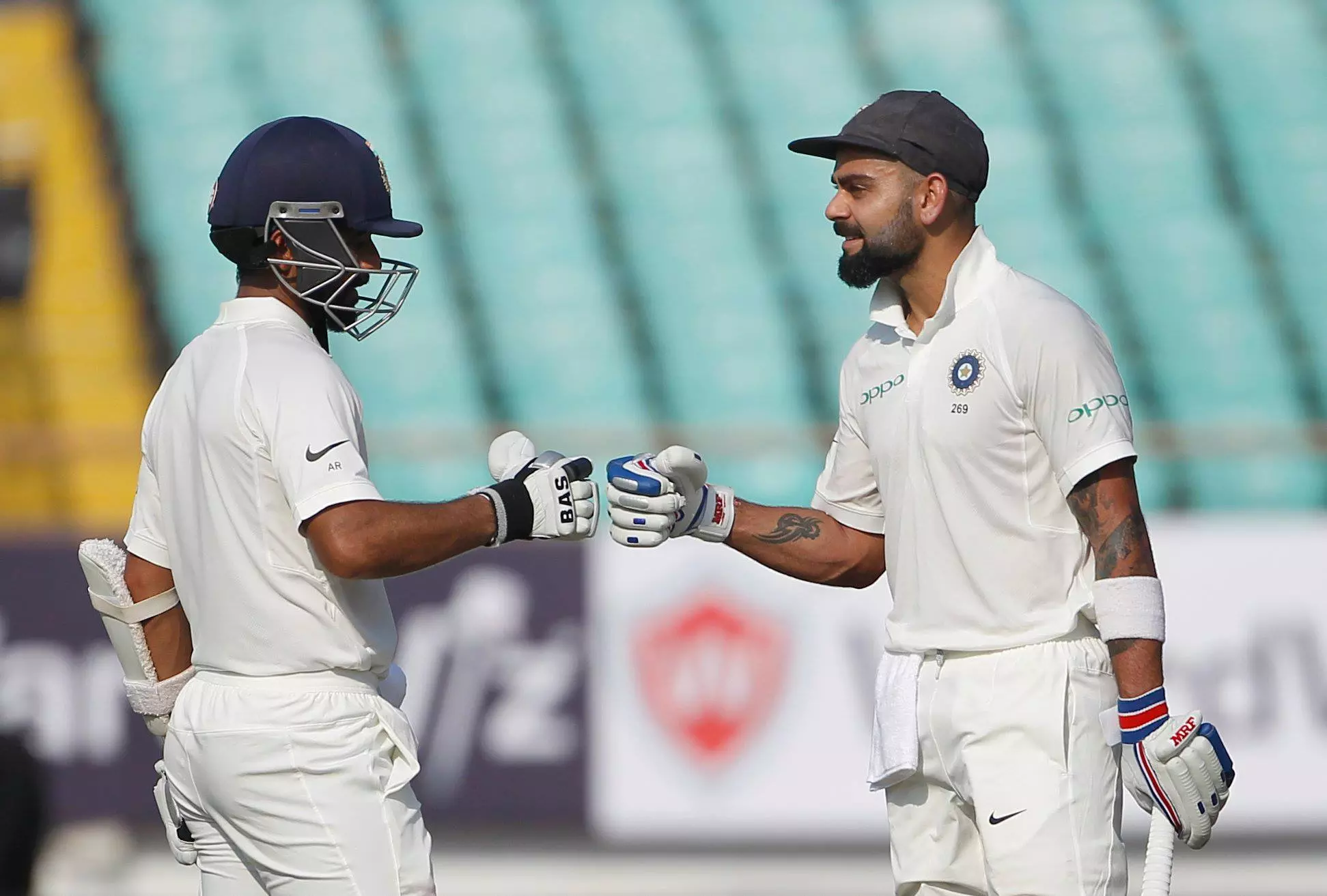 നേരത്തെ, അരങ്ങേറ്റ ടെസ്റ്റില് കന്നി സെഞ്ചുറി നേടിയ ഓപ്പണര് പൃഥ്വി ഷായുടെയും പത്തൊമ്പതാം ടെസ്റ്റ് അര്ധസെഞ്ചുറി നേടിയ ചേതേശ്വര് പൂജാരയുടെയും മികവിലാണ് ആദ്യ ദിനം ഇന്ത്യ നാലു വിക്കറ്റ് നഷ്ടത്തില് 364 റണ്സെടുത്തത്. ഷാ 154 പന്തില് 19 ബൗണ്ടറികളോടെ 134 റണ്സെടുത്തു പുറത്തായി. പൂജാര 130 പന്തില് 14 ബൗണ്ടറി സഹിതം 86 റണ്സെടുത്തു. രണ്ടാം വിക്കറ്റില് ഷാ-പൂജാര സഖ്യം ഇരട്ടസെഞ്ചുറി കൂട്ടുകെട്ടും (206), നാലാം വിക്കറ്റില് കോഹ്ലി -രഹാനെ സഖ്യം സെഞ്ചുറി കൂട്ടുകെട്ടും (105) തീര്ത്താണ് ഇന്ത്യന് ഇന്നിങ്സിന് കരുത്തായത്. രഹാനെ 92 പന്തില് അഞ്ചു ബൗണ്ടറി സഹിതം 41 റണ്സെടുത്തു പുറത്തായി.