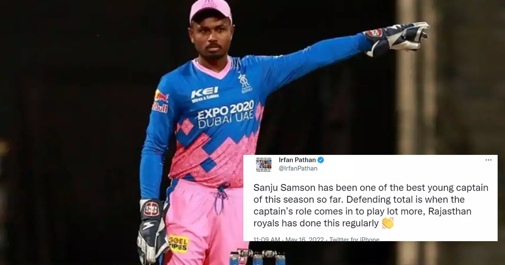 'ഈ സീസണിലെ ഏറ്റവും മികച്ച യുവക്യാപ്റ്റന്മാരിൽ ഒരാളാണ് സഞ്ജു സാംസൺ. ടോട്ടൽ ഡിഫൻഡ് ചെയ്യുമ്പോഴാണ് ക്യാപ്റ്റന്റെ റോൾ കളത്തിൽ കൂടുതൽ കാണാനാകുക. രാജസ്ഥാൻ റോയൽസ് അത് കളത്തിൽ സ്ഥിരമായി മികച്ച രീതിയിൽ ചെയ്യുന്നു' - ഇർഫാൻ ട്വീറ്റു ചെയ്തു.