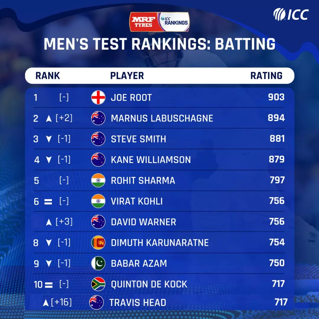 അതേസമയം ബാറ്റര്മാരില് ഇംഗ്ലണ്ട് താരം ജോ റൂട്ട് ഒന്നാം സ്ഥാനം നിലനിര്ത്തിയപ്പോള് ആസ്ട്രേലിയയുടെ മാർനസ് ലാബുഷാഗ്നെ കെയ്ന് വില്യംസണെയും സ്റ്റീവ് സ്മിത്തിനെയും പിന്തള്ളി രണ്ടാം സ്ഥാനത്തെത്തി. സമിത്തും വില്യംസണും യഥാക്രമം മൂന്നും നാലും സ്ഥാനത്തേക്ക് ഇറങ്ങി. റാങ്കിങ്ങില് ഏറ്റവുമധികം കുതിച്ചുചാട്ടം നടത്തിയത് ഓസീസിന്റെ ട്രാവിസ്ഹെഡ് ആണ്. 16 സ്ഥാനങ്ങള് മെച്ചപ്പെടുത്തിയ ട്രാവിസ്ഹെഡ് ദക്ഷിണാഫ്രിക്കയുടെ ക്വിന്റണ് ഡികൊക്കുമായി പത്താം സ്ഥാനം പങ്കിട്ടു. ഇംഗ്ലണ്ടിനെതിരായ ആഷസ് ടെസ്റ്റിലെ പ്രകടനമാണ് ട്രാവിസ്ഹെഡിന് റാങ്കിങ്ങില് നേട്ടമുണ്ടാക്കാന് സാധിച്ചത്.