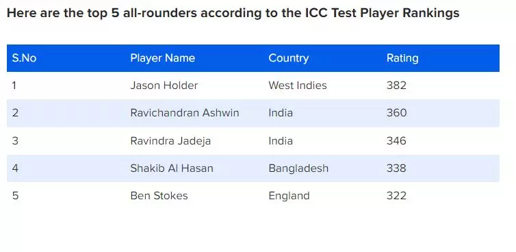 ഓള്റൌണ്ടര്മാരുടെ പട്ടികയില് വിന്ഡിസിന്റെ ജേസണ് ഹോള്ഡറാണ് ഒന്നാം സ്ഥാനത്ത്. ഇന്ത്യന് താരങ്ങളായ അശ്വിനും രവീന്ദ്ര ജഡേജയും രണ്ടും മൂന്നും സ്ഥാനത്തുണ്ട്. ബംഗ്ലാദേശിന്റെ ഷാക്കിബ് അല് ഹസന് നാലാം സ്ഥാനത്തും ഇംഗ്ലണ്ട് താരം ബെന് സ്റ്റോക്സ് അഞ്ചാം സ്ഥാനവും സ്വന്തമാക്കി,