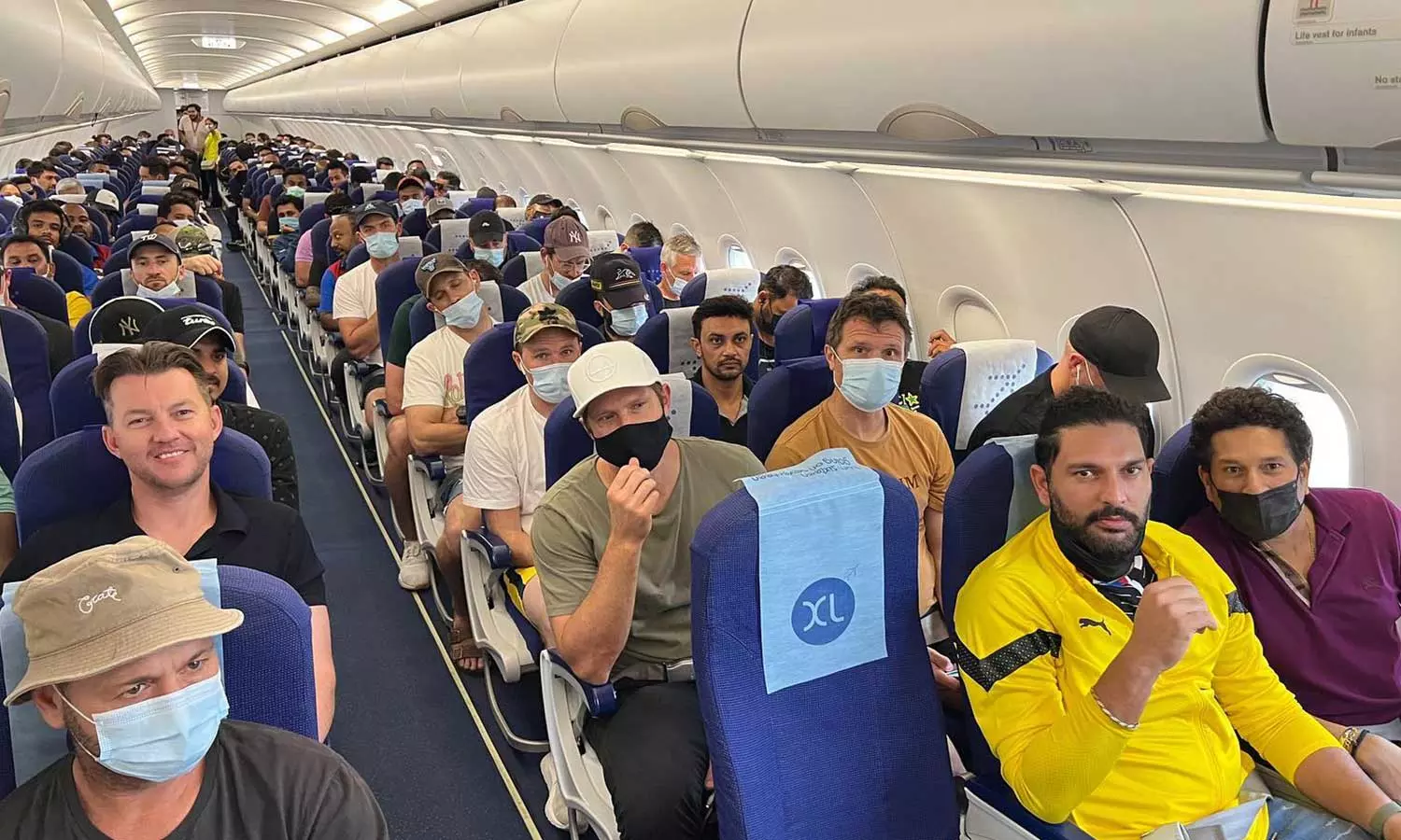 Summary: Sachin Tendulkar shares rare image of retired cricket stars travelling in the same flight as part of Road Safety World Series 2022