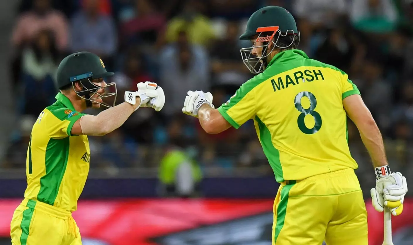 ടി20 ലോകകപ്പിലെ ഏറ്റവും ഉയർന്ന ടീം ടോട്ടൽ പിന്തുടർന്ന് ബാറ്റിങ്ങിനിറങ്ങിയ ആസ്ട്രേലിയ്ക്ക് തുടക്കത്തിൽ തന്നെ നായകൻ ആരോൺ ഫിഞ്ചി(അഞ്ച്)നെ നഷ്ടമായി. ട്രെന്റ് ബോൾട്ടിന്റെ മനോഹരമായ പന്തിൽ ഡാരിൽ മിച്ചൽ പിടിച്ചുപുറത്താകുകയായിരുന്നു. മൂന്നാമനായെത്തിയ മാർഷുമായി ചേർന്ന് വാര്ണര് കൂറ്റനടികളുമായി തകർത്താടുന്നതാണ് പിന്നീട് കണ്ടത്. പവർപ്ലേ തൊട്ട് തുടങ്ങിയ അഴിഞ്ഞാട്ടം അവസാന ഓവർവരെ ഓസീസ് തുടർന്നു. ബൗളിങ്ങിൽ ഒരു ഘട്ടത്തിലും കിവീസിന് മേധാവിത്വം പുലർത്താൻ വാർണറും മാർഷും അവസരം നൽകിയില്ല. എന്നാൽ, ടൂർണമെന്റിലെ ടോപ്സ്കോററാകാൻ ഏതാനും റണ്സ് മാത്രമകലെ വാർണർ വീണു. വീണ്ടും ബോൾട്ടിന്റെ മനോഹരമായ ഡെലിവറി വാർണറുടെ കുറ്റി പിഴുതെറിയുമ്പോൾ 38 പന്തിൽ 53 റൺസ് നേടിയിരുന്നു താരം. മൂന്ന് സിക്സറും നാല് ബൗണ്ടറിയും വാർണറുടെ ഇന്നിങ്സിന് മിഴിവേകി.