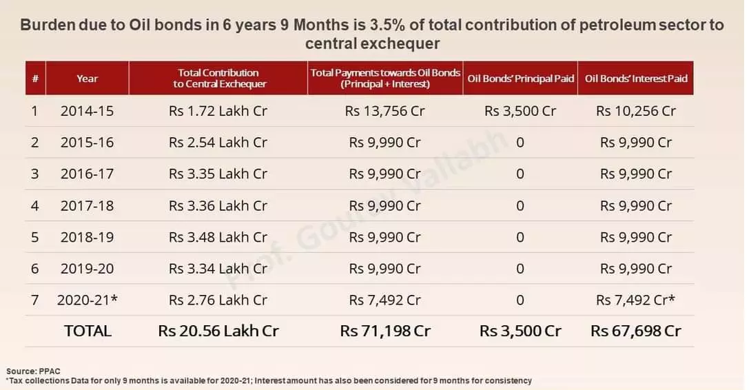 എന്നാൽ 2014 ഏപ്രിൽ മുതൽ 2021 മാർച്ച് വരെ മാത്രം ഇന്ധന നികുതിയിൽ നിന്ന് കേന്ദ്രസർക്കാർ സ്വന്തം കീശയിലാക്കിയത് 22.5 ലക്ഷം കോടിയാണ്. ഓയിൽ ബോണ്ടിന്റെ പലിശയായി 67,500 കോടിയും ബോണ്ട് തിരിച്ചടവായി 3,500 കോടി രൂപയും മാത്രമാണ് ഇതുവരെ സർക്കാർ തിരിച്ചടച്ചിട്ടുള്ളത്. അഥവാ, ജനങ്ങളിൽ നിന്ന് വാങ്ങിയ നികുതിപ്പണത്തിന്റെ മൂന്നു ശതമാനം മാത്രമാണ് സർക്കാർ എണ്ണക്കമ്പനികൾക്ക് നൽകിയത്. 2020-21 സാമ്പത്തിക വർഷത്തിൽ മാത്രം 4,53,812 കോടി രൂപയാണ് നികുതിയിനത്തിൽ സർക്കാർ ഈടാക്കിയിട്ടുള്ളത്.