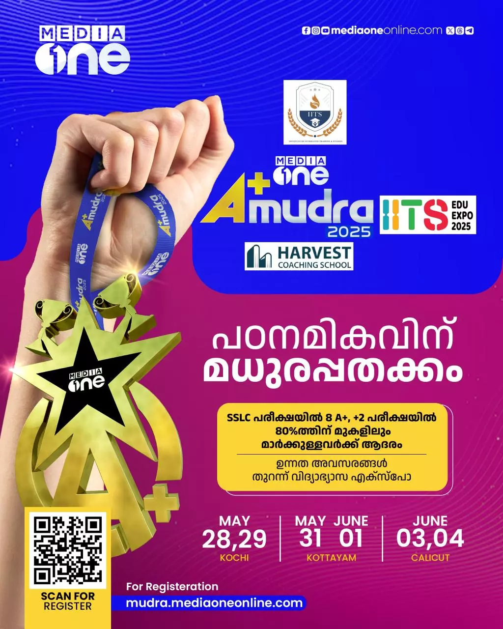 പത്താംക്ലാസ്, പ്ലസ്ടു പരീക്ഷകളിലെ വിജയികൾക്കായി നടത്തുന്ന കേരളത്തിലെ ഏറ്റവും വലിയ അനുമോദനത്തിൽ പങ്കെടുക്കാനായി ഇപ്പോൾ തന്നെ mudra.mediaoneonline.com എന്ന വെബ്സൈറ്റിൽ ലോഗിൻ ചെയ്യൂ. അല്ലെങ്കിൽ മുകളിൽ കൊടുത്തിരിക്കുന്ന ക്യൂആർ കോഡ് സ്കാൻ ചെയ്യൂ.