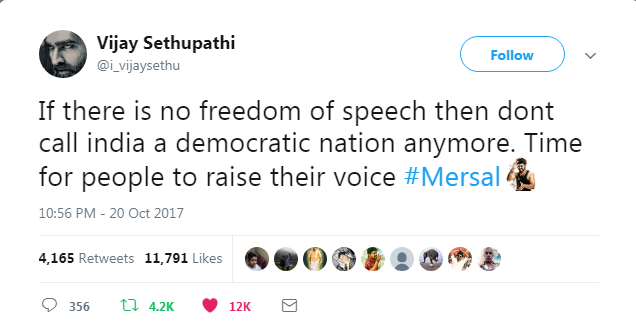 'അഭിപ്രായ സ്വാതന്ത്ര്യം ഇല്ലെങ്കില് ഇന്ത്യയെ ഒരു ജനാധിപത്യ രാജ്യമെന്ന് ഇനിയും വിശേഷിപ്പിക്കരുത്. ജനങ്ങള് ശബ്ദമുയര്ത്തേണ്ട അവസരമാണിത്' എന്നാണ് മെര്സലിനെ പിന്തുണച്ചുള്ള വിജയ് സേതുപതിയുടെ ട്വീറ്റ്. ഇതുവരെ ഏകദേശം 12000ത്തോളം ലൈക്കാണ് വിജയ്സേതുപതിയുടെ ട്വീറ്റിന് ലഭിച്ചത്.