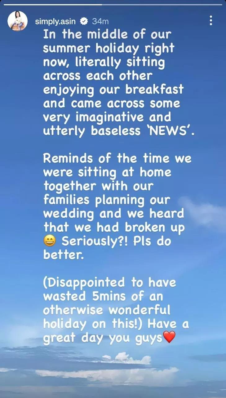 'ഞങ്ങളിപ്പോൾ വേനലവധിയുടെ മധ്യത്തിലാണ്. ഒരുമിച്ചിരുന്ന് പ്രാതൽ ആസ്വദിക്കുന്നു. സാങ്കൽപ്പികവും അടിസ്ഥാനരഹിതവുമായ 'വാർത്ത'കളിലൂടെ കടന്നു പോകുന്നു. ഞങ്ങളുടെ കുടുംബങ്ങൾ ഒന്നിച്ചിരുന്ന് കല്യാണം പ്ലാൻ ചെയ്യുമ്പോൾ ഞങ്ങൾ പിരിയുകയാണ് എന്ന വാർത്ത വന്നത് ഓർക്കുന്നു. കുറച്ചു കൂടി നല്ലതു ചെയ്യൂ. വിസ്മയകരമായ അവധിക്കാലം ചെലവഴിക്കുന്ന വേളയിൽ അഞ്ചു മിനിറ്റ് നഷ്ടപ്പെടുത്തിയതിൽ നിരാശയുണ്ട്. നിങ്ങൾക്ക് സുദിനം നേരുന്നു' - എന്നാണ് അസിൻ ഇൻസ്റ്റഗ്രാം സ്റ്റോറിയിൽ കുറിച്ചത്.