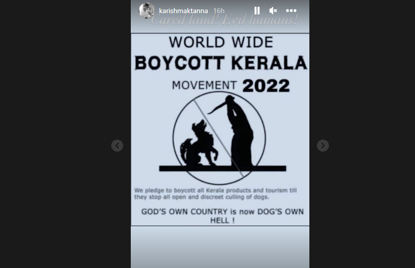 ഇന്സ്റ്റഗ്രാം സ്റ്റോറിയിലാണ് കരിഷ്മ കേരളത്തിനെതിരെ വിദ്വേഷ പ്രചാരണം നടത്തിയത്. ദൈവത്തിന്റെ സ്വന്തം നാട് ഇന്ന് നായ്ക്കളുടെ നരകമായെന്നാണ് പോസ്റ്ററില് പറയുന്നത്. കേരളത്തിലെ വിനോദസഞ്ചാര മേഖലയും കേരള ഉത്പന്നങ്ങളും ബഹിഷ്കരിക്കണമെന്നും ആവശ്യപ്പെട്ടു.