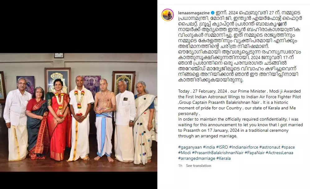 ‘ഇന്ന്, 2024 ഫെബ്രുവരി 27 ന്, നമ്മുടെ പ്രധാനമന്ത്രി, മോദി ജി, ഇന്ത്യൻ എയർഫോഴ്സ് ഫൈറ്റർ പൈലറ്റ്, ഗ്രൂപ്പ് ക്യാപ്റ്റൻ പ്രശാന്ത് ബാലകൃഷ്ണൻ നായർക്ക് ആദ്യത്തെ ഇന്ത്യൻ ബഹിരാകാശയാത്രിക വിംഗുകൾ സമ്മാനിച്ചു. ഇത് നമ്മുടെ രാജ്യത്തിനും നമ്മുടെ കേരളത്തിനും വ്യക്തിപരമായി എനിക്കും അഭിമാനത്തിന്റെ ചരിത്ര നിമിഷമാണ്. ഔദ്യോഗികമായി ആവശ്യപ്പെടുന്ന രഹസ്യസ്വഭാവം കാത്തുസൂക്ഷിക്കുന്നതിനായി, 2024 ജനുവരി 17-ന് ഞാൻ പ്രശാന്തിനെ ഒരു പരമ്പരാഗത ചടങ്ങിൽ അറേഞ്ച്ഡ് മാര്യേജിലൂടെ വിവാഹം കഴിച്ചുവെന്ന് നിങ്ങളെ അറിയിക്കാൻ. ഞാൻ ഈ അറിയിപ്പിനായി കാത്തിരിക്കുകയായിരുന്നു.’ലെന കുറിച്ചു.
