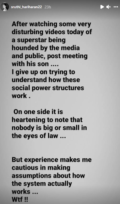 "മാധ്യമങ്ങളും പൊതു ജനങ്ങളും അദ്ദേഹത്തെ വേട്ടയാടുന്ന വിഡിയോകള് എന്നെ വല്ലാതെ അസ്വസ്ഥയാക്കി. സമൂഹം ഇത്തരം കാര്യങ്ങളോട് പ്രതികരിക്കുന്ന രീതി എനിക്ക് മനസ്സിലാക്കാന് കഴിയുന്നില്ല. നിയമത്തിന് മുന്നില് ആരും ചെറുതല്ല, വലുതല്ല എന്ന സത്യം അംഗീകരിക്കുമ്പോഴും, സമൂഹത്തിന്റെ നിലപാടുകള് കാണുമ്പോള് എനിക്ക് കൗതുകം തോന്നുന്നു."- ശ്രുതി പറയുന്നു.
