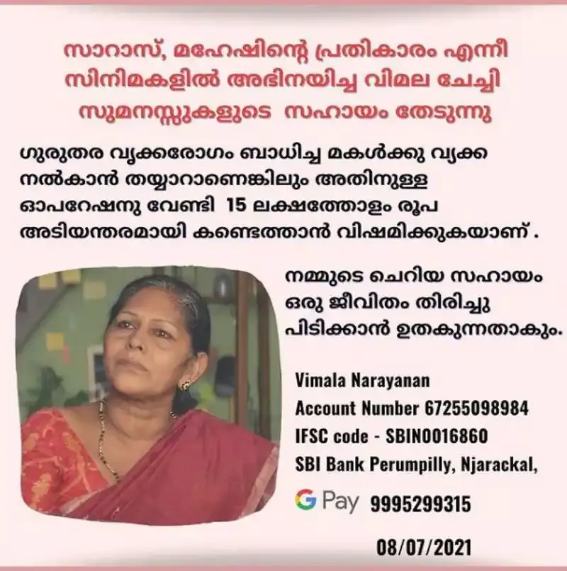 'ഇതെന്റെ മോളാണ്. അവൾക്ക് കിഡ്നിയ്ക്ക് അസുഖം തുടങ്ങിയിട്ട് ആറ് വർഷത്തോളമായി. ഡയാലിസിസ് ചെയ്തുകൊണ്ടിരിക്കുകയാണ്. അതിനുപോലും ഇപ്പോൾ നിവൃത്തിയില്ലാതിരിക്കുകയാണ്.കിഡ്നി മാറ്റിവയ്ക്കണമെന്ന് പറഞ്ഞു.ഞാൻ കിഡ്നി കൊടുക്കാന്ന് വിചാരിച്ചതാണ്. പക്ഷേ ഓപ്പറേഷൻ ചെയ്യാൻ പോലും ഞങ്ങളുടെ കയ്യില് കാശില്ല.ദയവു ചെയ്ത് എല്ലാവരും സഹായിക്കണം.യാതൊരു വഴിയുമില്ല'- വിമല പറഞ്ഞു.