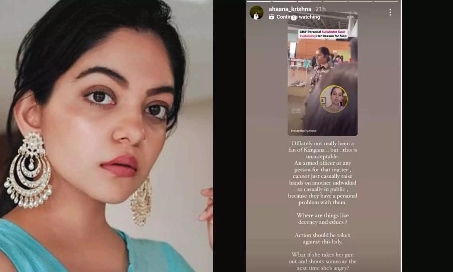 നടിയും നിയുക്ത എംപിയുമായ കങ്കണ റണാവത്തിന് വിമാനത്താവളത്തിൽ വെച്ച് അടിയേറ്റ സംഭവത്തിൽ പ്രതികരണവുമായി നടി അഹാന കൃഷ്ണ. അടുത്ത തവണ ദേഷ്യം വരുമ്പോൾ ഉദ്യോഗസ്ഥ തോക്കെടുത്ത് വെടിവെച്ചാൽ എന്ത് ചെയ്യും എന്നാണ് അഹാനയുടെ ചോദ്യം. ഇൻസ്റ്റഗ്രാം സ്റ്റോറിയിലൂടെയായിരുന്നു അഹാനയുടെ പ്രതികരണം.