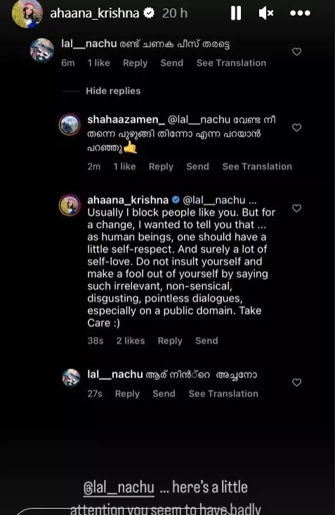 അഹാനയുടെ ഇൻസ്റ്റഗ്രാം പോസ്റ്റിലാണ് ലാൽ നച്ചു എന്ന അക്കൗണ്ടിൽ നിന്നും മോശം കമന്റ് വന്നത്. ''രണ്ട് ചാണക പീസ് തരട്ടെ'' എന്നായിരുന്നു കമന്റ്.''സാധാരണയായി നിങ്ങളെപ്പോലുള്ളവരെ ഞാൻ ബ്ലോക്ക് ചെയ്യാറാണ് പതിവ്. എന്നാൽ ഒരു വ്യത്യസ്തയ്ക്കു വേണ്ടി ഇത് നിങ്ങളോട് പറയാൻ ഞാൻ ആഗ്രഹിക്കുന്നു. മനുഷ്യരായാൽ അൽപ്പം ആത്മാഭിമാനം ഉണ്ടാകുന്നത് നല്ലതാണ്. അവനവനോടെങ്കിലും ആത്മാർഥമായ സ്നേഹം ഉറപ്പായും വേണം. ഇത്തരം ബുദ്ധിശൂന്യമായ, അറയ്ക്കുന്ന അർഥശൂന്യമായ ഡയലോഗുകൾ പൊതുമധ്യത്തിൽ പറഞ്ഞുകൊണ്ട് സ്വയം അപമാനിക്കുകയും സ്വയം വിഡ്ഢിയാവുകയും ചെയ്യരുത്, സ്വയം സൂക്ഷിക്കുക.''എന്നായിരുന്നു അഹാനയുടെ മറുപടി.