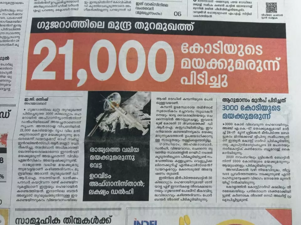 |21000 കോടിയുടെ മയക്കുമരുന്ന് വേട്ടയാണ് ഇന്നലെ ഗുജറാത്ത് മുന്ദ്രയിലെ അദാനി തുറമുഖത്ത് നടന്നത്