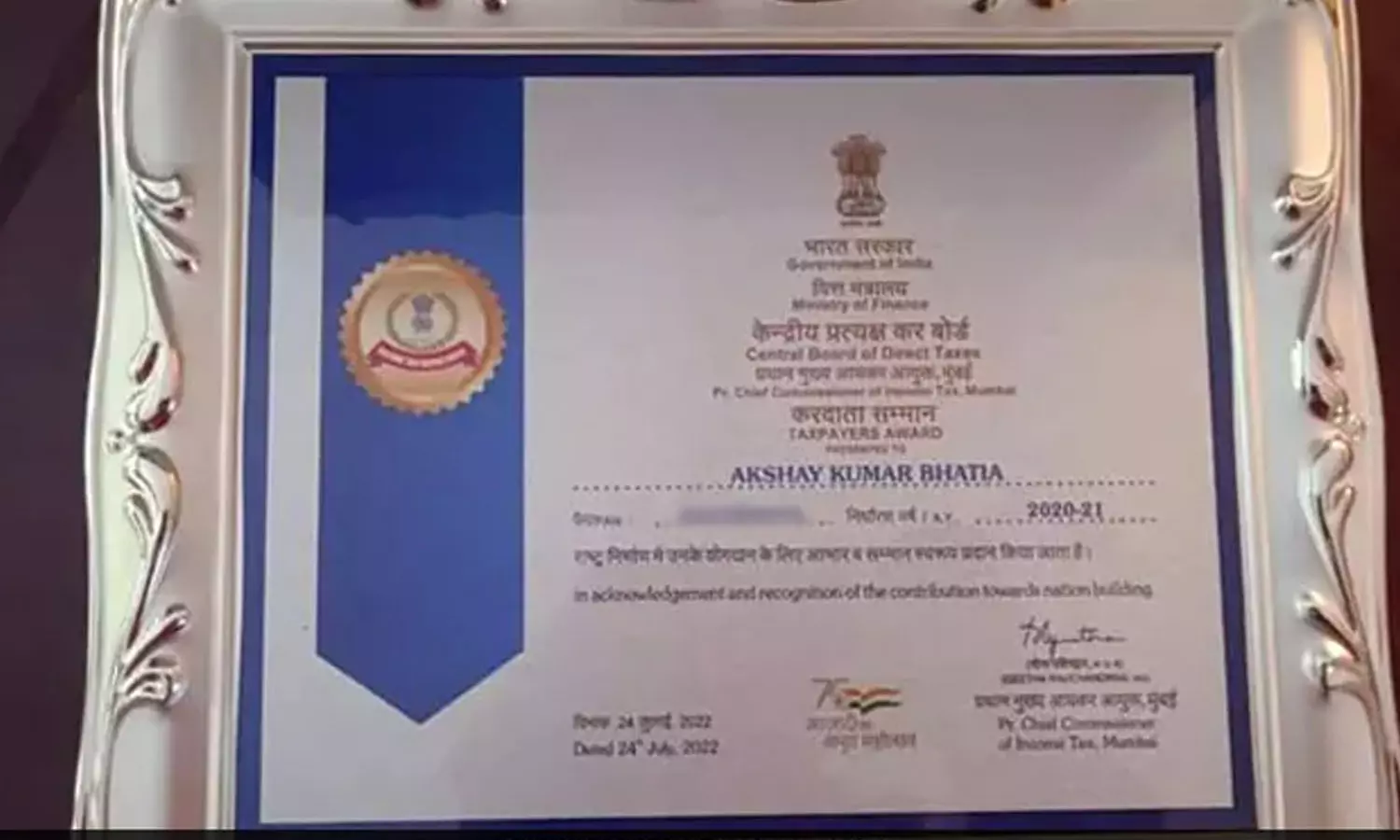 ബോളിവുഡിലെ ഏറ്റവും ഉയർന്ന പ്രതിഫലം വാങ്ങുന്ന താരങ്ങളിലൊരാളാണ് അക്ഷയ് കുമാർ. ഇപ്പോൾ രാജ്യത്തെ ഏറ്റവും കൂടുതൽ നികുതിയടക്കുന്ന വ്യക്തി എന്ന നിലയിൽ അക്ഷയ്കുമാറിന് ആദായ നികുതി വകുപ്പിന്റെ അംഗീകാരം കൂടി ലഭിച്ചിരിക്കുകയാണ്. അക്ഷയ് കുമാറിനെ അഭിനന്ദിച്ചു കൊണ്ടുള്ള ആദായ നികുതി വകുപ്പിന്റെ സർട്ടഫിക്കറ്റാണ് ഇപ്പോൾ വൈറലായിരിക്കുന്നത്.