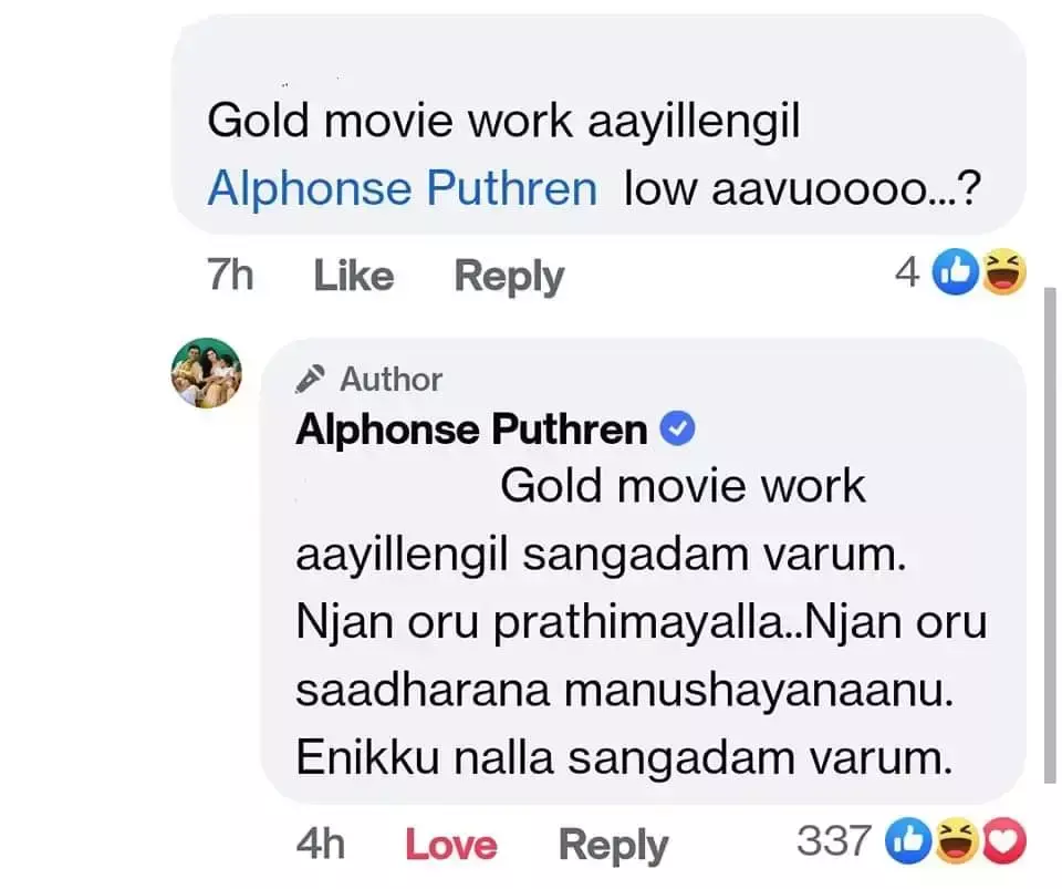 'ഗോൾഡ് മൂവി വർക്ക് ആയില്ലെങ്കിൽ അൽഫോൻസ് പുത്രൻ ലോ ആവുവോ' എന്നായിരുന്നു ഫേസ്ബുക്ക് കമന്റിലൂടെ ആരാധകന്റെ ചോദ്യം. 'ഗോൾഡ് മൂവി വർക് ആയില്ലെങ്കിൽ സങ്കടം വരും. ഞാൻ ഒരു പ്രതിമയല്ല. ഞാൻ ഒരു സാധാരണ മനുഷ്യനാണ്. എനിക്ക് നല്ല സങ്കടം വരും'എന്നായിരുന്നു പ്രേമം സംവിധായകന്റെ മറുപടി.