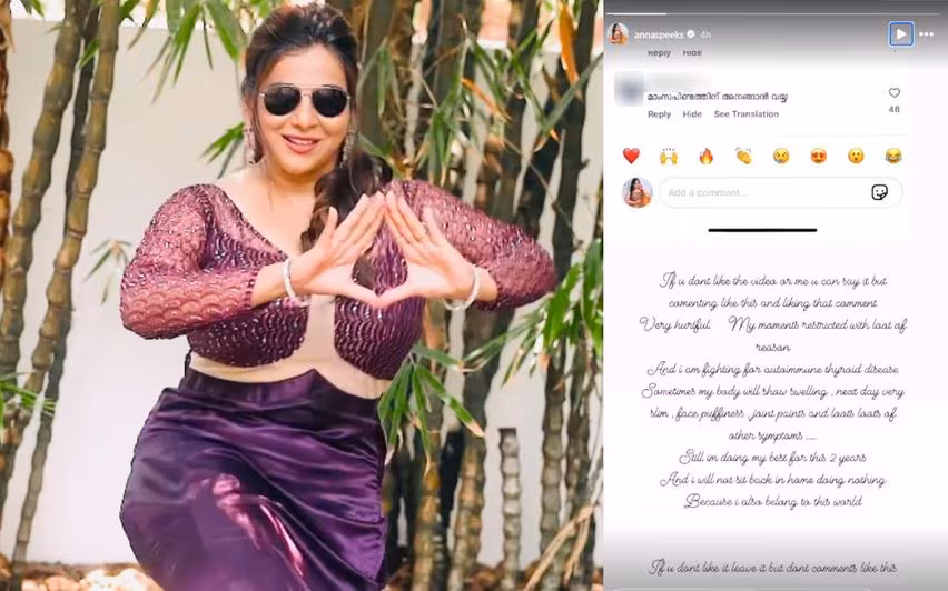 നിങ്ങള്ക്ക് എന്നെയോ ഞാന് പോസ്റ്റ് ചെയ്യുന്ന വീഡിയോകളോ ഇഷ്ടപ്പെടുന്നില്ലെങ്കില് അത് പറയാം. പക്ഷെ ഇത് പോലെയുള്ള കമന്റ് ഇടുന്നതും ആ കമന്റിന് പലരും ലൈക്ക് ചെയ്യുന്നത് കാണുന്നതും വളരെ വേദനാജനകമാണ്. ആ നൃത്ത വീഡിയോയില് എന്റെ ചലനങ്ങള്ക്ക് തടസമാകുന്ന നിരവധി കാര്യങ്ങളുണ്ടായിരുന്നു. ഞാന് ഓട്ടോ ഇമ്മ്യൂണ് തൈറോയ്ഡ് രോഗത്തിനെതിരെ പോരാടുന്ന ഒരു വ്യക്തിയാണ്.