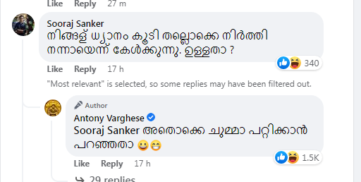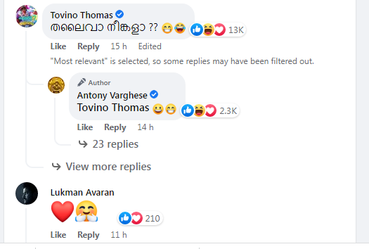 നിരവധി രസകരമായ കമന്റുകളാണ് ആന്റണിയുടെ പോസ്റ്റിന് താഴെ വന്നുകൊണ്ടിരിക്കുന്നത്. 'ക്ലൈമാക്സില് മണവാളൻ ഗ്യാങ്ങും അങ്കമാലി ഗ്യാങ്ങും പുതിയ വേറെയൊരു പ്രശ്നവുമായി വന്നു ഒരു എൻഡിങ് വന്നിരുന്നെങ്കിൽ' എന്നായിരുന്നു ഒരു ആരാധകന്റെ ആഗ്രഹം. ലെ പെപ്പേട്ടൻ.. ന്നാലും ആ കല്യാണ ഇടിയിൽ എങ്കിലും എന്നേ guest ആയിട്ട് വിളിക്കാമായിരുന്നു ടോവി ബ്രോ. ചുമ്മാ വന്നോരും പോയോരും വരെ ഇടി എന്നിട്ടാണ്, തല്ലു പടം ആണെന്ന് കേട്ടപ്പോള് നിങ്ങളെയാ പ്രതീക്ഷിച്ചത്.... എന്തായലും അടി തുടങ്ങി വെച്ചില്ലേ,അടി എന്ന് പറഞ്ഞാൽ അത് അജഗാജന്തരം ...എന്നിങ്ങനെ പോകുന്നു കമന്റുകള്.