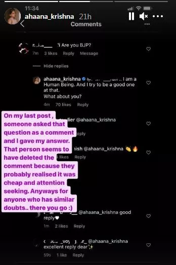അച്ഛന് കൃഷ്ണകുമാര് ബിജെപി സ്ഥാനാര്ഥിയായി തിരുവനന്തപുരത്ത് മത്സരിച്ചതോടെ അഹാനയുടെ രാഷ്ട്രീയം സംബന്ധിച്ചും ചോദ്യങ്ങള് ഉണ്ടാവാറുണ്ട്. 'നിങ്ങള് ബിജെപിയാണോ' എന്ന ഇന്സ്റ്റഗ്രാമിലെ പോസ്റ്റിന് താഴെയുള്ള കമന്റിന് അഹാന മറുപടി നല്കി- 'ഞാന് മനുഷ്യനാണ്. കൂടുതല് മെച്ചപ്പെട്ട മനുഷ്യനാകാനാണ് ശ്രമിക്കുന്നത്. നിങ്ങളോ?'.