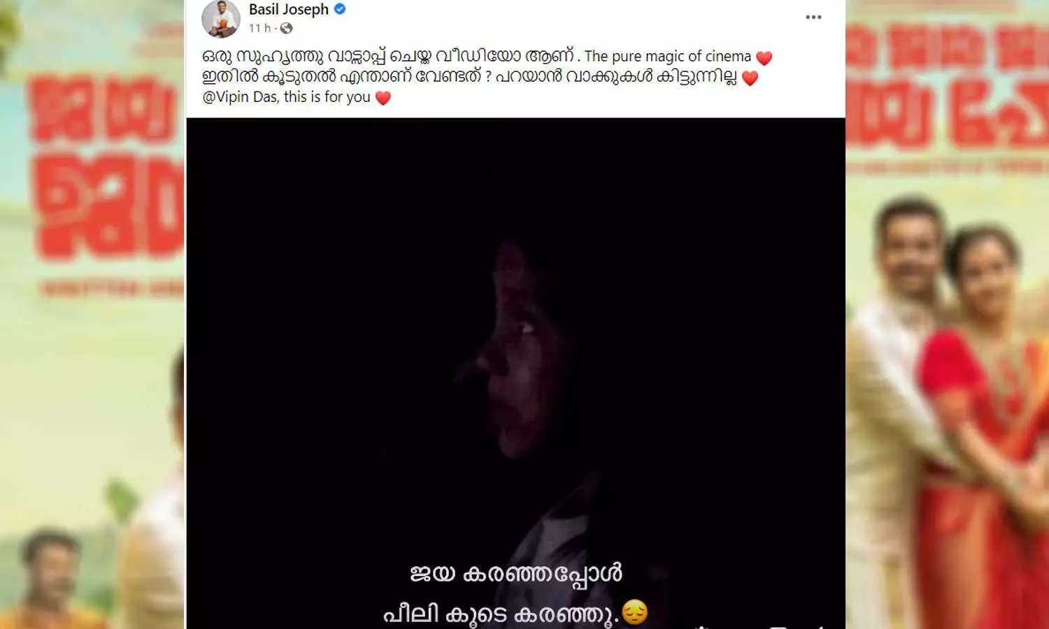 'ജയകരഞ്ഞപ്പോൾ പീലി കൂടെ കരഞ്ഞു, ജയ പുഞ്ചിരിച്ചപ്പോൾ പീലിയും പുഞ്ചിരിച്ചു, എന്റെ മറ്റ് പെണ്ണുങ്ങളും എന്നാണ് വീഡിയോയിലുള്ള അടിക്കുറിപ്പ്. 'സുഹൃത്ത് വാട്സാപ്പിൽ അയച്ചുതന്ന വീഡിയോയാണിത് . സിനിമയുടെ ശരിക്കുമുള്ള മാജിക്.. ഇതിൽപരം എന്താണ് വേണ്ടത്..വിപിൻദാസ് ഇതു നിനക്കായി എന്ന അടിക്കുറിപ്പോടെയാണ് ബേസിൽ ഈ വീഡിയോ പങ്കുവെച്ചത്. അജുവർഗീസടക്കം നിരവധി പേർ ബേസിലിന്റെ പോസ്റ്റ് പങ്കുവെച്ചിട്ടുണ്ട്. 'ഞാന് കരുതി എനിക്ക് മാത്രമാണ് കരച്ചിൽ വന്നതെന്ന്', 'കൊച്ചുകുഞ്ഞിന്റെ മനസ് വരെ പിടിച്ചുകുലുക്കിയെങ്കിൽ ഫിലിം വേറെ ലെവൽ ആണ് അതിൽ സംശയം ഇല്ല', 'ഇതാണ് സിനിമയുടെ വിജയം' തുടങ്ങി നിരവധി കമന്റുകളും പോസ്റ്റിന് താഴെ ലഭിക്കുന്നുണ്ട്.
