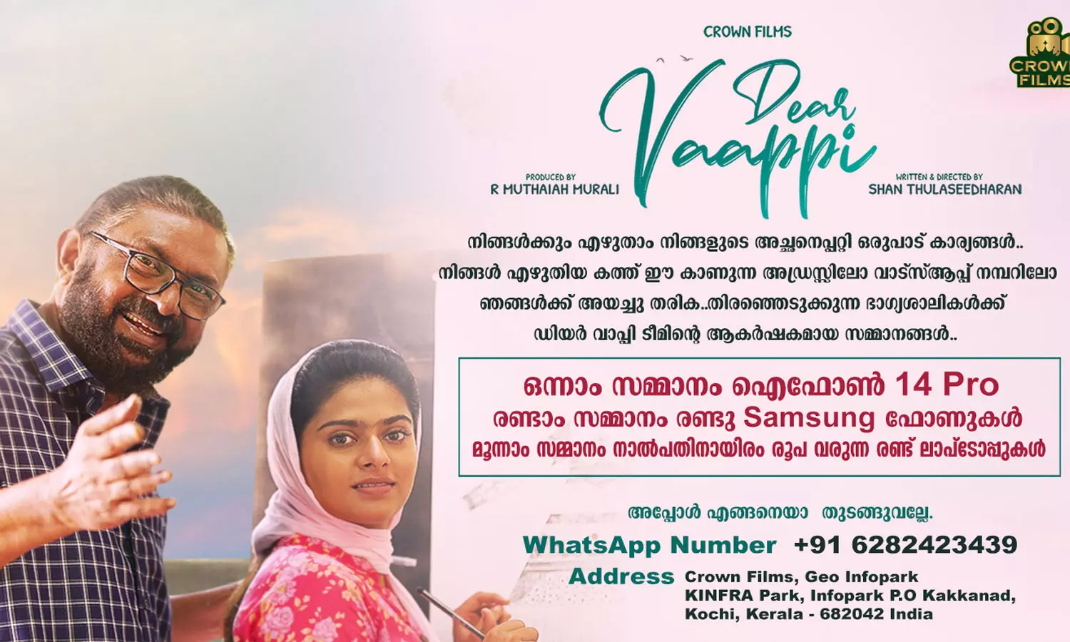 പറഞ്ഞാലും തീരാത്ത കാര്യങ്ങളുണ്ടോ നിങ്ങളുടെ അച്ഛനെ കുറിച്ച്. എന്നാൽ, അതിൽ ചില ഓർമ്മകൾ കോർത്തിണക്കി ഒരു കുറിപ്പാക്കി 'ഡിയർ വാപ്പി' ടീമിന് അയച്ചോളൂ. ഭാഗ്യമുണ്ടെങ്കിൽ ഐ ഫോൺ 14 തന്നെ നിങ്ങൾക്ക് സ്വന്തമാക്കാം. എഴുതിയ കത്ത് താഴെ പോസ്റ്ററിൽ കാണുന്ന അഡ്രസിലോ വാട്സ്ആപ്പ് നമ്പറിലോ അയച്ചു കൊടുത്താൽ മാത്രം മതി.