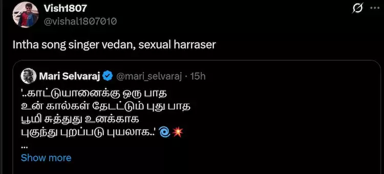 'സ്ത്രീപീഡകന് അവസരം നൽകി'; വേടനെ തമിഴിൽ പാടിപ്പിച്ച മാരി സെൽവരാജിനെതിരെ സൈബർ ആക്രമണം
