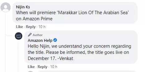 പ്രിയദര്ശന്റെ സംവിധാനത്തില് ഒരുക്കിയ ബിഗ് ബജറ്റ് ചിത്രം മരക്കാര് അറബിക്കടലിന്റെ സിംഹം ആമസോണ് പ്രൈമിലൂടെ ഡിസംബര് 17ന് പുറത്തിറങ്ങും. ആമസോണ് പ്രൈം തന്നെയാണ് ഇക്കാര്യം ഔദ്യോഗികമായി അറിയിച്ചത്. ആമസോണ് ഹെല്പ്പ് എന്ന ഫേസ്ബുക്ക് ഹാന്ഡിലൂടെയാണ് ചിത്രത്തിന്റെ ഒ.ടി.ടി റിലീസ് സ്ഥിരീകരിച്ചത്. ചിത്രം 17ന് ആമസോണ് പ്രൈം പ്ലാറ്റ്ഫോമില് ലൈവ് ആകുമെന്നാണ് അറിയിച്ചത്.