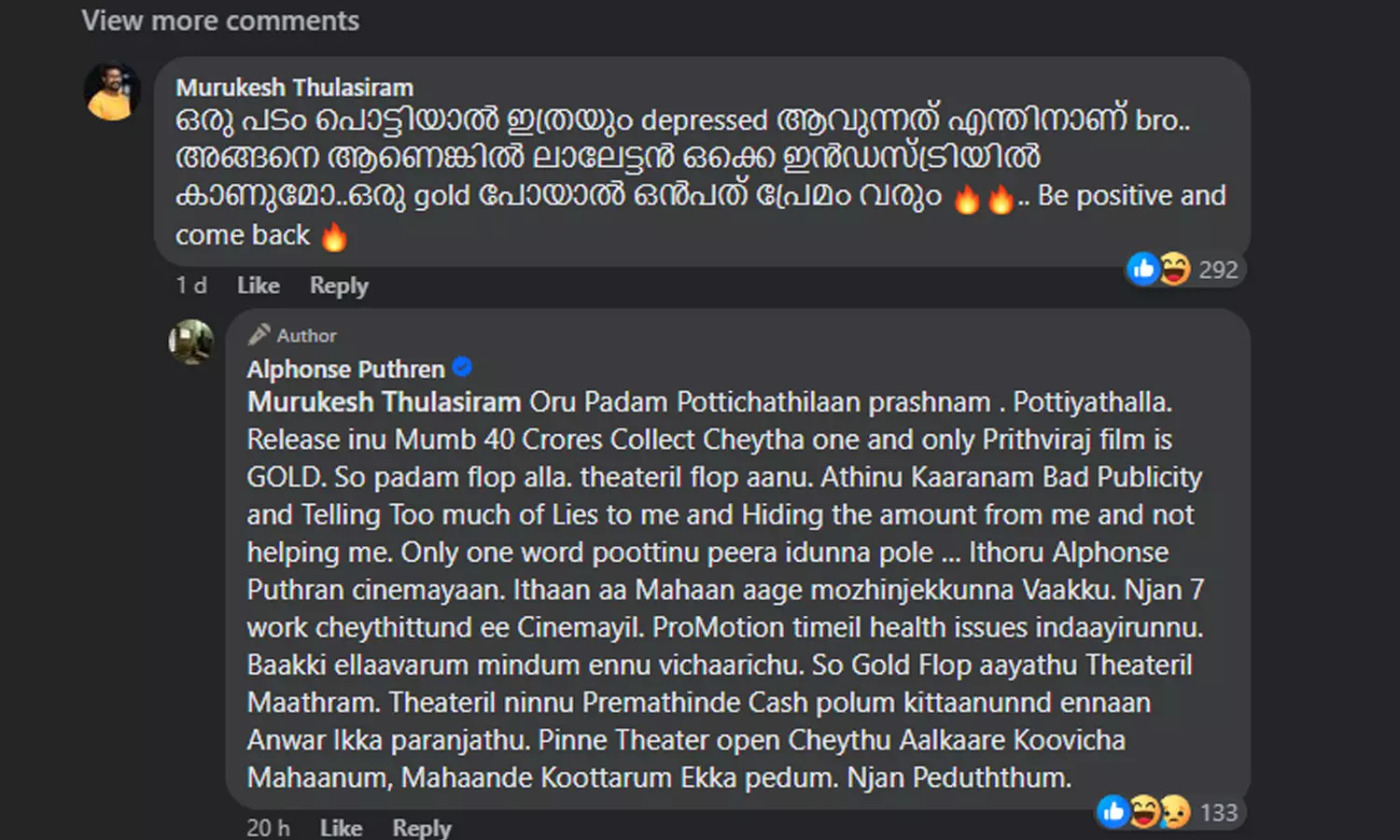 'പടം പൊട്ടിയതല്ല, പൊട്ടിച്ചതിലാണ് പ്രശ്നം. റിലീസിന് മുമ്പ് 40 കോടി കളക്ട് ചെയ്ത ഏക പൃഥ്വിരാജ് ചിത്രമാണ് ഗോൾഡ്. ചിത്രം ഫ്ലോപ്പ് അല്ല, തിയറ്ററിൽ പരാജയമാണ്. അതിന് കാരണം മോശം പബ്ലിസിറ്റിയാണ്. ഒരുപാട് നുണകൾ എന്നോട് പറഞ്ഞു. കിട്ടിയ തുകയും എന്നിൽ നിന്ന് മറച്ചുവെച്ചു. ആരും സഹായിച്ചില്ല. പുട്ടിന് പീര എന്ന പോലെ ഒരു അൽഫോൺസ് പുത്രൻ ചിത്രം എന്നാണ് ആ മഹാൻ ആകെ മൊഴിഞ്ഞ വാക്ക്. സിനിമയിൽ ഏഴ് ജോലികൾ ഞാൻ ചെയ്തിരുന്നു. പ്രമോഷൻ സമയത്ത് ആരോഗ്യ പ്രശ്നങ്ങളെ തുടർന്ന് മാറി നിന്നിരുന്നു. ബാക്കിയെല്ലാവരും സംസാരിക്കുമെന്നാണ് കരുതിയത്. ഗോൾഡ് പരാജയപ്പെട്ടത് തിയറ്ററുകളിൽ മാത്രമാണ്. ഇനിയും പ്രേമത്തിന്റെ പണം തിയറ്ററുകളിൽ നിന്ന് കിട്ടാനുണ്ടെന്നാണ് അൻവർ ഇക്ക പറഞ്ഞത്. തിയറ്ററുകളിൽ ആളെക്കൊണ്ട് കൂവിച്ച മഹാനും മഹാന്റെ കൂടെയുള്ളവരും എല്ലാം പെടും. ഞാൻ പെടുത്തും'- അൽഫോൺസ് പുത്രൻ പറഞ്ഞു.