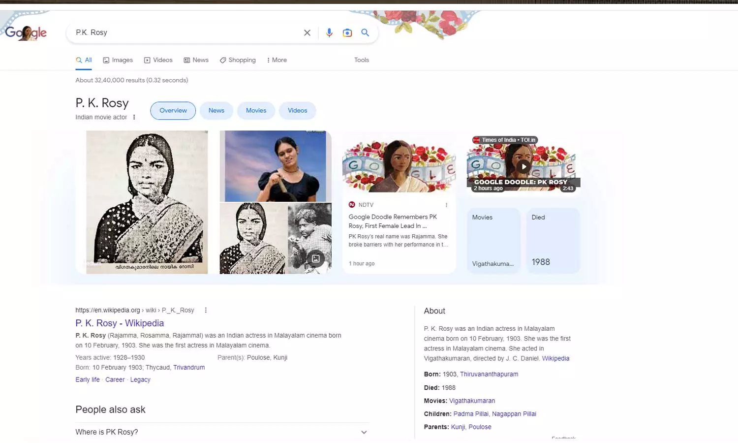 മലയാളത്തിന്റെ ആദ്യ നായിക പി.കെ റോസിക്ക് ആദരമര്പ്പിച്ച് ഗൂഗിളിന്റെ ഡൂഡില്
