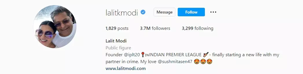 ലളിത് മോദിയുടെ ഇന്സ്റ്റഗ്രാം പേജിലെ മാറ്റം കണ്ടാണ് ആരാധകരുടെ ചോദ്യം. ആദ്യം സുസ്മിതക്കൊപ്പമുള്ള ചിത്രമായിരുന്നു മോദിയുടെ പ്രൊഫൈല് ഫോട്ടോ. എന്നാലിപ്പോള് ഐപിഎല്ലിന്റെ പശ്ചാത്തലത്തിലുള്ള തന്റെ ചിത്രമാണ് ലളിത് മോദി പ്രൊഫൈല് ഫോട്ടോ ആക്കിയിരിക്കുന്നത്. ഇന്സ്റ്റഗ്രാം ബയോയില് 'finally starting a new life with my partner in crime.My love' എന്ന് സുസ്മിത സെന്നിനെ മെന്ഷന് ചെയ്തിരുന്നു. ഇതും നീക്കം ചെയ്തിട്ടുണ്ട്. പകരം "Founder @iplt20 INDIAN PREMIER LEAGUE - Moon.എന്നാണ് കൊടുത്തിരിക്കുന്നത്. തിങ്കളാഴ്ചയാണ് മോദി തന്റെ ഇന്സ്റ്റഗ്രാം പേജില് മാറ്റം വരുത്തിയത്.