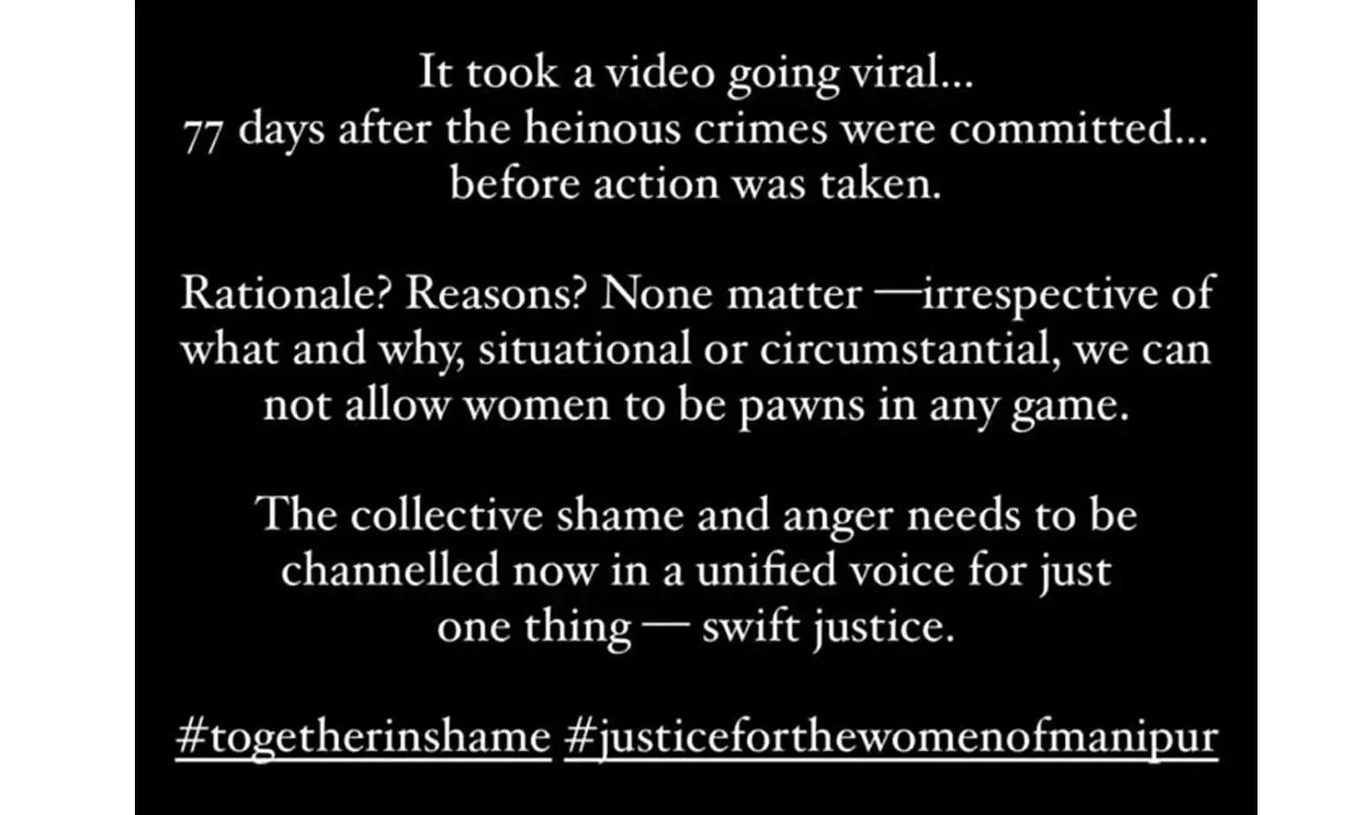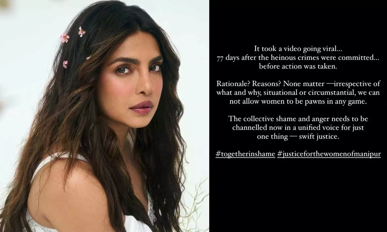 സ്തീകളെ പണയവസ്തുവാക്കാൻ അനുവദിക്കില്ലെന്നും മണിപ്പൂരിലെ സ്ത്രീകളുടെ നീതിക്കായി ശബ്ദമുയർത്തണമെന്നും പ്രിയങ്ക ഇൻസ്റ്റഗ്രാമിൽ കുറിച്ചു
