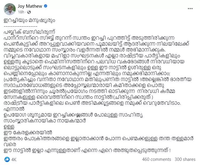 പബ്ലിക് ബസിലിരുന്ന് പാന്റ്സിന്റെ സിബ്ബ് തുറന്ന് സ്വന്തം ഇറച്ചി പുറത്തിട്ട് അടുത്തിരിക്കുന്ന പെൺകുട്ടിക്ക് അറപ്പുളവാക്കിയവനെ പൂമാലയിട്ട് ആദരിക്കുന്ന നിലയിലേക്ക് നമ്മുടെ നവോഥാന സംസ്കാരം വളർന്നതിൽ നമ്മൾ അഭിമാനിക്കുക.