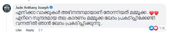|മമ്മൂട്ടിയുടെ ഫേസ്ബുക്ക് പോസ്റ്റിന് താഴെയാണ് ജൂഡ് ആന്റണി കമന്റിലൂടെ ഖേദപ്രകടനം നടത്തിയത്