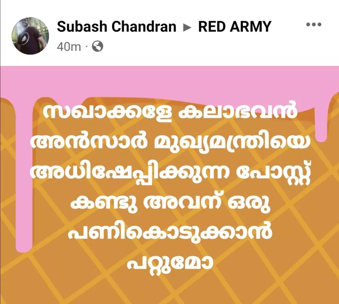 'ലോകത്തില് ഏറ്റവും വലിയ മനുഷ്യന്, പിണറായി വിജയന്..... ലോകത്തില് ഏറ്റവും വലിയ മനുഷ്യന്, പിണറായി വിജയന്. ആ ഭരണം കണ്ടോ, ടിം...ടിം... ഈ ഭരണം കണ്ടോ ടിം...ടിം.... നാണമില്ല ല്ലേ'- എന്നിങ്ങനെയാണ് തിരുവാതിര പാട്ടിന് സമാനമായ വരികളോടെ കലാഭവന് അന്സാര് ചൊല്ലി കളിക്കുന്നത്. അന്സാറിന്റെ സുഹൃത്തുക്കളായ ചിലരെയും വീഡിയോയില് കാണാവുന്നതാണ്.
