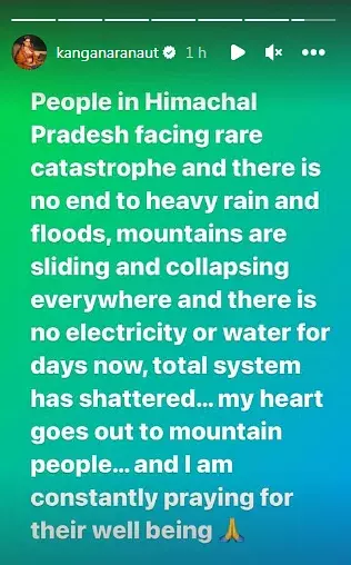 “ഹിമാചൽ പ്രദേശിലെ ജനങ്ങൾ അപൂർവ ദുരന്തം നേരിട്ടുകൊണ്ടിരിക്കുകയാണ്. കനത്ത മഴയ്ക്കും വെള്ളപ്പൊക്കത്തിനും അവസാനമില്ല. മലകൾ ഇടിയുന്നു, എല്ലായിടവും തകരുകയാണ്. ദിവസങ്ങളായി വൈദ്യുതിയോ വെള്ളമോ ഇല്ല, മൊത്തം സംവിധാനം തന്നെ തകര്ന്നു. മലയോരത്തെ ആളുകള്ക്കൊപ്പമാണ് എന്റെ ഹൃദയം. അവരുടെ ക്ഷേമത്തിനായി നിരന്തരം പ്രാര്ഥിക്കുന്നു'' കങ്കണ ഇന്സ്റ്റഗ്രാം സ്റ്റോറിയില് കുറിച്ചു.