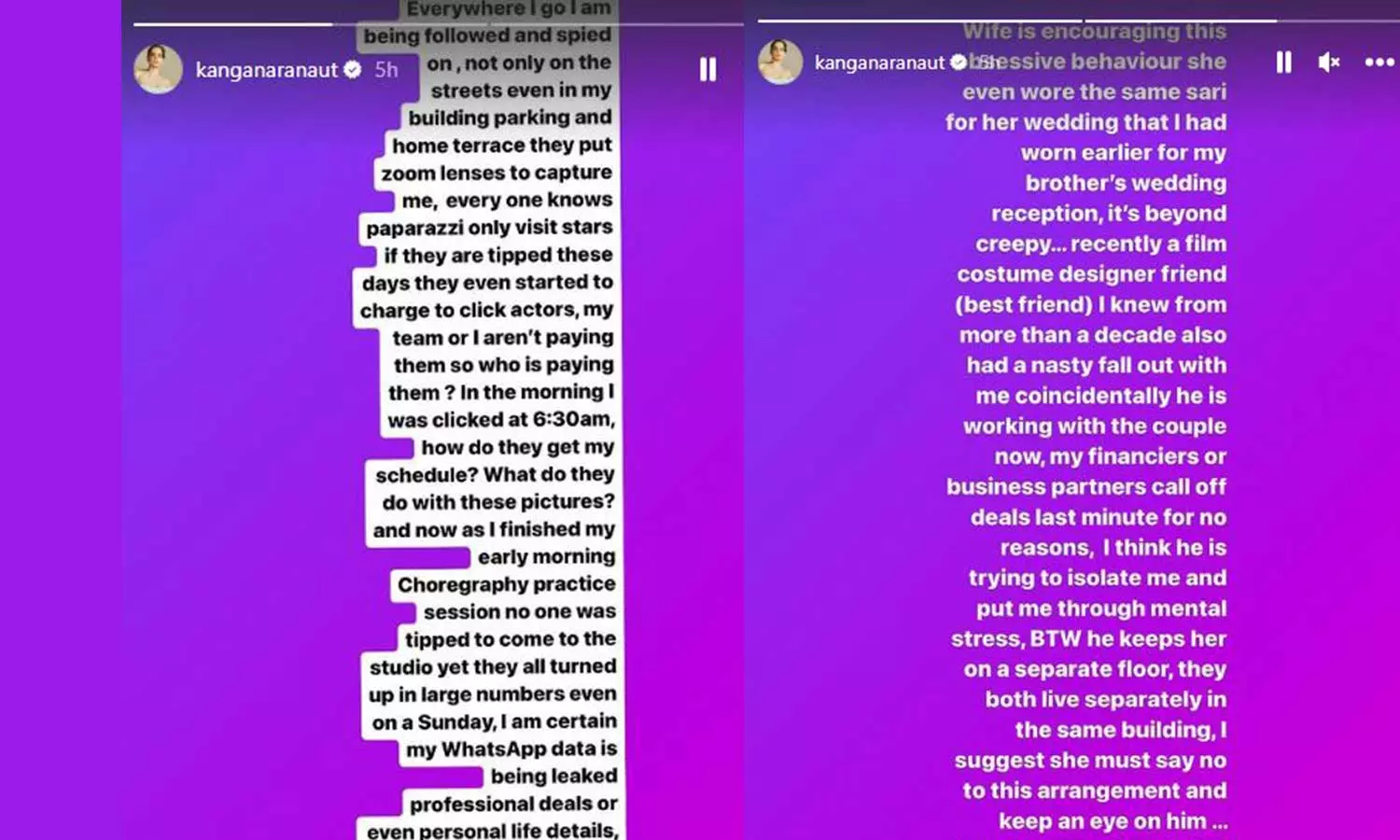 ഞാൻ പോകുന്നിടത്തെല്ലാം എന്നെ പിന്തുടരുകയും ചാരവൃത്തി നടത്തുകയും ചെയ്യുന്നു. തെരുവുകളിൽ മാത്രമല്ല, എന്റെ കെട്ടിട പാർക്കിങ്ങിലും വീടിന്റെ ടെറസിൽ പോലും അവർ എന്നെ ചിത്രം പകർത്താൻ സൂം ലെൻസുകൾ വച്ചിട്ടുണ്ട്. ഇപ്പോൾ പാപ്പരാസികൾ വരെ വല്ലതും കിട്ടിയാൽ മാത്രമാണ് താരങ്ങളെ സന്ദർശിക്കാനെത്താറുള്ളതെന്ന് എല്ലാവർക്കും അറിയാം. അഭിനേതാക്കൾക്ക് ഫോട്ടോ എടുത്തുകൊടുക്കാൻ പണം ഈടാക്കുക പോലും തുടങ്ങിയിട്ടുണ്ട്. എന്റെ ടീമോ ഞാനോ അവർക്ക് പണം നൽകുന്നില്ല. പിന്നെ ആരാണ് ഇവർക്ക് പണം നൽകുന്നത്?-ഇൻസ്റ്റഗ്രാം സ്റ്റോറിയിൽ കങ്കണ പറയുന്നു.