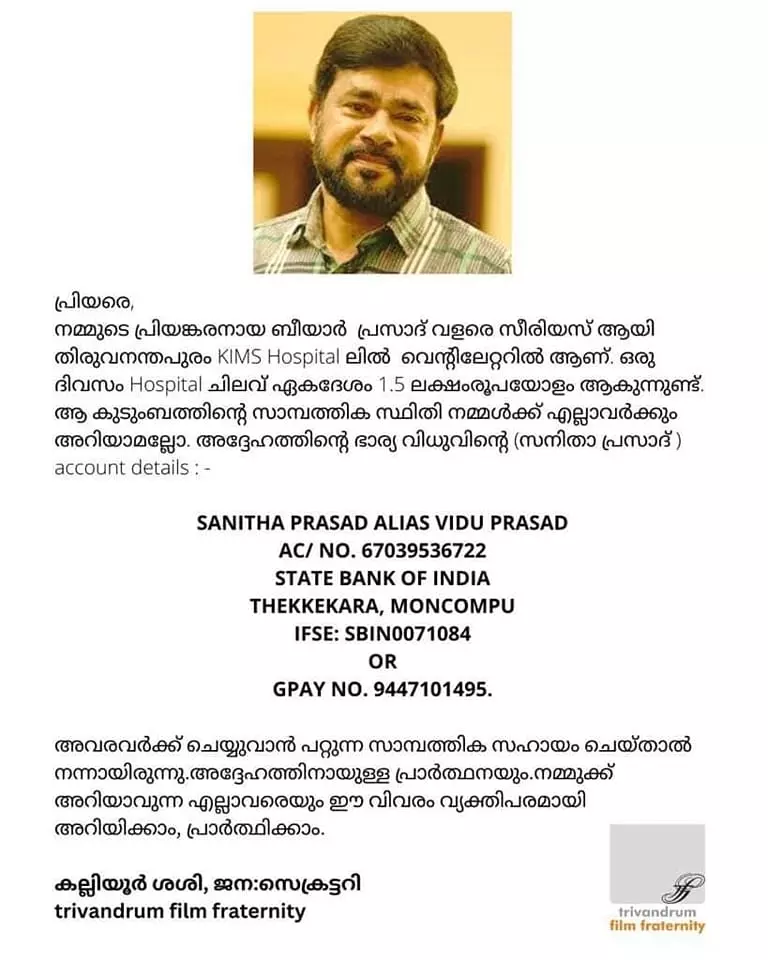 സുഹൃത്തും,എഴുത്തുകാരനും, കവിയും, പ്രഭാഷകനുമായ പ്രിയപ്പെട്ട ശ്രീ.ബീയാർ പ്രസാദ് വളരെ സീരിയസ് ആയി തിരുവനന്തപുരം കിംസ് ഹോസ്പിറ്റലിൽ വെന്റിലേറ്ററിൽ ആണ്. ഒരു ദിവസം ഹോസ്പിറ്റല് ചെലവിനായി ഏകദേശം 1.5 ലക്ഷം രൂപയോളം വേണ്ടി വരുന്നുണ്ട് കുടുംബത്തിന്റെ സാമ്പത്തിക സ്ഥിതി വളരെ മോശമായ അവസ്ഥയിലുമാണ്. അദ്ദേഹത്തിന്റെ ഭാര്യ വിധുവിന്റെ (സനിതാ പ്രസാദ് ) അക്കൗണ്ട് വിവരം താഴെ കൊടുക്കുന്നു. അവരവർക്ക് ചെയ്യുവാൻ പറ്റുന്ന സാമ്പത്തിക സഹായം ചെയ്താൽ നന്നായിരുന്നു.നമ്മുക്ക് അറിയാവുന്ന എല്ലാവരെയും ഈ വിവരം വ്യക്തിപരമായി അറിയിക്കാം, പ്രാർത്ഥിക്കാം.