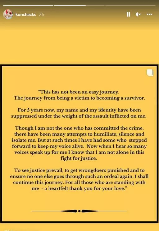 ഇരയാക്കപ്പെട്ടതിൽനിന്ന് അതിജീവനത്തിലേക്കുള്ള യാത്ര ഒരിക്കലും എളുപ്പമായിരുന്നില്ലെന്ന് നടി കുറിച്ചു. ''അഞ്ചുവർഷമായി എന്റെ പേരും വ്യക്തിത്വവും എനിക്ക് സംഭവിച്ച അതിക്രമത്തിനിടയിൽ അടിച്ചമർത്തപ്പെട്ടിരിക്കുകയാണ്. കുറ്റം ചെയ്തത് ഞാനല്ലെങ്കിലും എന്നെ അവഹേളിക്കാനും നിശബ്ദയാക്കാനും ഒറ്റപ്പെടുത്താനും ഒരുപാട് ശ്രമങ്ങളുണ്ടായിട്ടുണ്ട്. എന്നാൽ ചിലരൊക്കെ നിശബ്ദത ഭേദിച്ച് മുന്നോട്ട് വന്ന?ു; എനിക്കു വേണ്ടി സംസാരിക്കാൻ, എന്റെ ശബ്ദം നിലയ്ക്കാതിരിക്കാൻ. ഇന്ന് എനിക്കു വേണ്ടി നിലകൊള്ളുന്ന ഇത്രയും ശബ്ദങ്ങൾ കേൾക്കുമ്പോൾ ഞാൻ തനിച്ചല്ലെന്ന് തിരിച്ചറിയുന്നു.''-സമൂഹമാധ്യമങ്ങളിൽ പങ്കുവച്ച കുറിപ്പിൽ നടി സൂചിപ്പിച്ചു.