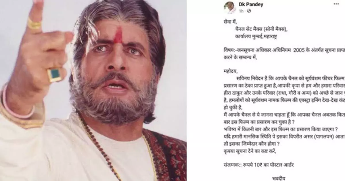 'നിങ്ങളുടെ ചാനൽ കാരണം, എനിക്കും എന്റെ കുടുംബത്തിനും ഇപ്പോൾ ഹീരാ താക്കൂറിനെയും (സിനിമയിൽ ബിഗ് ബി അവതരിപ്പിച്ച കഥാപാത്രം) അദ്ദേഹത്തിന്റെ കുടുംബത്തെയും (രാധ, ഗൗരി) ഞങ്ങളുടെ സ്വന്തം ബന്ധുക്കളെ പോലെ അറിയാം. ഞങ്ങൾക്ക് എല്ലാ ഡയലോഗുകളും മനഃപാഠമാണ്. നിങ്ങൾ (ചാനൽ) ഈ ചിത്രം ഇനിയും എത്ര തവണ സംപ്രേഷണം ചെയ്യുമെന്ന് ഞാൻ ചോദിക്കാൻ ആഗ്രഹിക്കുന്നു. അങ്ങനെ ചിത്രം സ്ഥിരമായി കാണിക്കുന്നത് എന്റെ മാനസിക നിലയെയും വിവേകത്തെയും ബാധിച്ചാൽ ആര് ഉത്തരവാദിത്തമേറ്റെടുക്കും? മുൻഗണനാക്രമത്തിൽ എന്റെ പരാതി പരിഹരിക്കാൻ ഞാൻ താഴ്മയോടെ അഭ്യർത്ഥിക്കുന്നു' പരാതിക്കാരൻ എഴുതി.