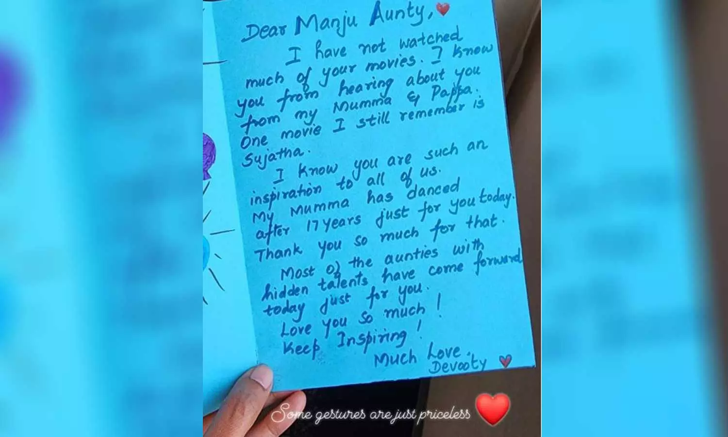 'ഡിയർ മഞ്ജു ആന്റി' എന്ന് പറഞ്ഞാണ് കത്ത് തുടങ്ങുന്നത്. 17 വർഷത്തിന് ശേഷം തന്റെ മമ്മ നൃത്തം ചെയ്തുവെന്നും അതിന് കാരണം മഞ്ജുവാന്റി ആണെന്നുമാണ് കത്തിന്റെ ചുരുക്കം. മമ്മയെ പോലെ ഒരുപാട് ആന്റിമാർക്ക് മഞ്ജുവാര്യാർ പ്രചോദനമാണെന്നും കുട്ടിആരാധികയുടെ കത്തിൽ പറയുന്നു. കത്ത് മഞ്ജു തന്നെയാണ് ഇൻസ്റ്റഗ്രാമിലൂടെ പങ്കുവെച്ചത്.