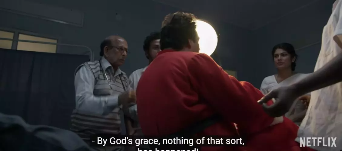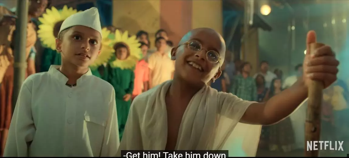നായകന് പക്ഷിയുടെ പ്രച്ഛന്ന വേഷത്തില് കാണപ്പെടുന്നത് കഥ നടക്കുന്ന കുറുക്കന്മൂല എന്ന സ്ഥലത്തെ ഒരു സ്കൂളിന്റെ വാര്ഷികാഘോഷത്തിലാണ്. ആ സ്കൂള് വാര്ഷികത്തില് ഗാന്ധിജിയുടെ വേഷമണിഞ്ഞ് നില്ക്കുന്ന ഒരു കുട്ടി, അടിക്കടാ, അടിച്ച് അവന്റെ തലമണ്ടയടിച്ച് പൊട്ടിക്കടാ എന്ന് പറയുന്നുണ്ട്. ഗാന്ധിജിയും അക്രമവും തമ്മില് എത്രത്തോളം ദൂരമുണ്ടെന്ന് ഏവര്ക്കും അറിയാവുന്നതാണ്. സ്കൂള് വാര്ഷികത്തില്വെച്ച് മിന്നല് മുരളിയെ പിടിക്കാനെത്തുന്ന പൊലീസുമായാണ് സംഘട്ടനം നടക്കുന്നത്.