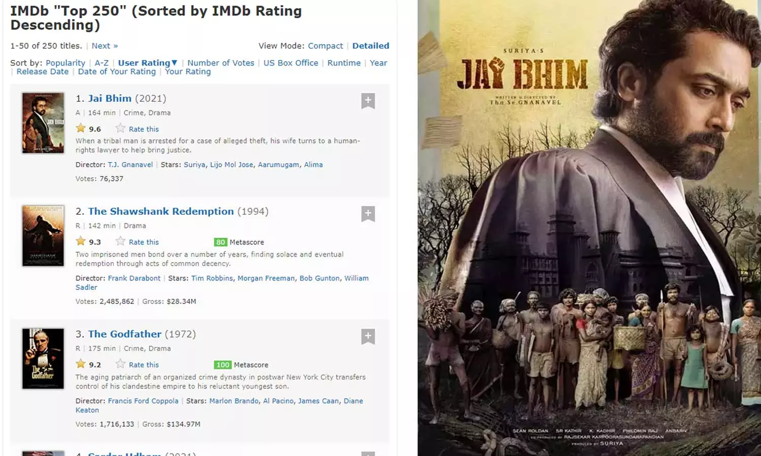 ഐഎംഡിബി റേറ്റിങ്ങിൽ 'ജയ് ഭീം' ഒന്നാമത്; എക്കാലത്തെയും ഉയർന്ന റേറ്റിംഗ്